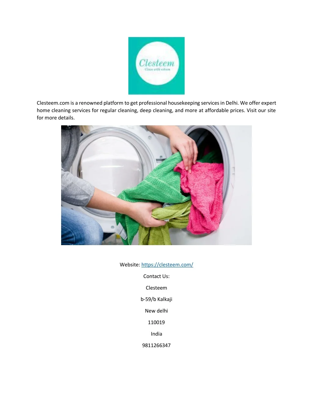 Clesteem.com is a renowned platform to get professional housekeeping services in Delhi. We offer expert home cleaning services for regular cleaning, deep cleaning, and more at affordable prices. Visit our site for more details. Website: https://clesteem.com/ Contact Us: Clesteem b-59/b Kalkaji New delhi 110019 India 9811266347