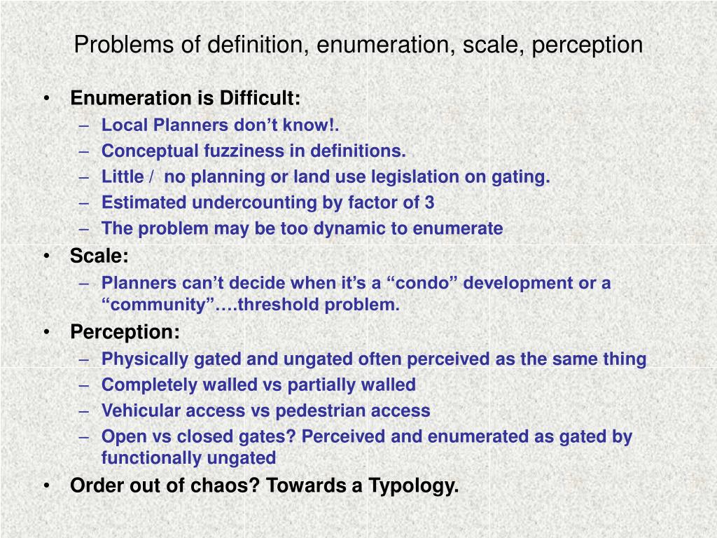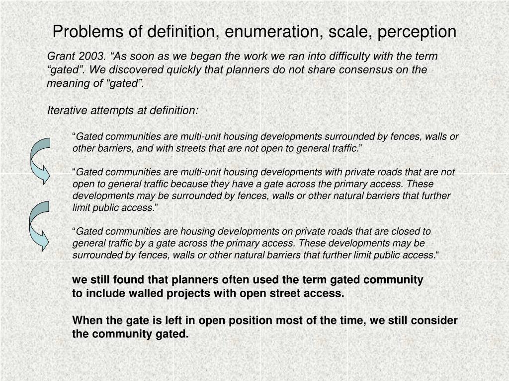 Problems of definition, enumeration, scale, perception • Grant 2003. “As soon as we began the work we ran into difficulty with the term “gated”. We discovered quickly that planners do not share consensus on the meaning of “gated”. • Iterative attempts at definition: • “Gated communities are multi-unit housing developments surrounded by fences, walls or other barriers, and with streets that are not open to general traffic.” • “Gated communities are multi-unit housing developments with private roads that are not open to general traffic because they have a gate across the primary access. These developments may be surrounded by fences, walls or other natural barriers that further limit public access.” • “Gated communities are housing developments on private roads that are closed to general traffic by a gate across the primary access. These developments may be surrounded by fences, walls or other natural barriers that further limit public access.“ • we still found that planners often used the term gated community • to include walled projects with open street access. • When the gate is left in open position most of the time, we still consider the community gated.