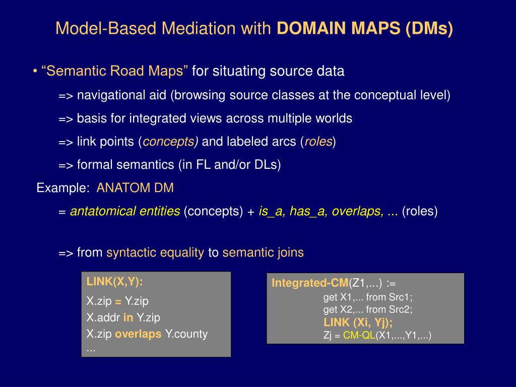 Model-Based Mediation with DOMAIN MAPS (DMs) • “Semantic Road Maps” for situating source data • => navigational aid (browsing source classes at the conceptual level) • => basis for integrated views across multiple worlds • => link points (concepts) and labeled arcs (roles) • => formal semantics (in FL and/or DLs) • Example: ANATOM DM • = antatomical entities (concepts) + is_a, has_a, overlaps, ... (roles) • => from syntactic equality to semantic joins LINK(X,Y): X.zip = Y.zip X.addr in Y.zip X.zip overlaps Y.county ... Integrated-CM(Z1,...) := get X1,... from Src1; get X2,... from Src2; LINK (Xi, Yj); Zj = CM-QL(X1,...,Y1,...)