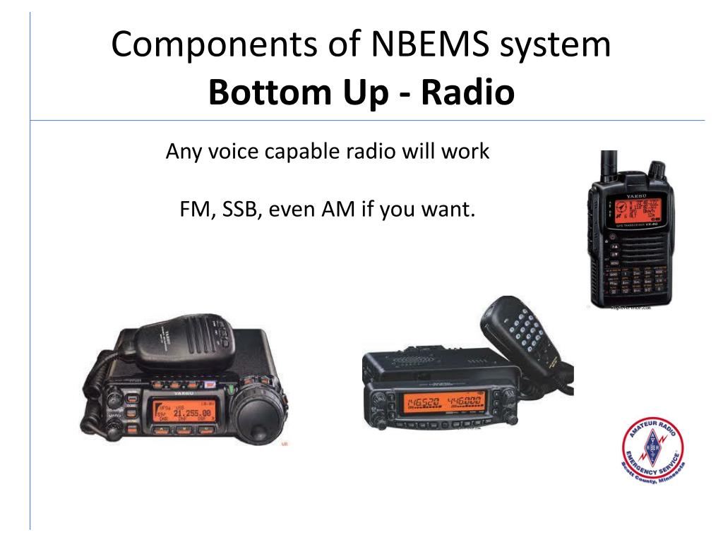 Components of NBEMS systemBottom Up - Radio Any voice capable radio will work FM, SSB, even AM if you want.