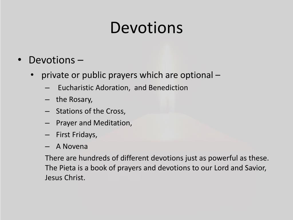 Devotions • Devotions – • private or public prayers which are optional – • Eucharistic Adoration, and Benediction • the Rosary, • Stations of the Cross, • Prayer and Meditation, • First Fridays, • A Novena There are hundreds of different devotions just as powerful as these. The Pieta is a book of prayers and devotions to our Lord and Savior, Jesus Christ.