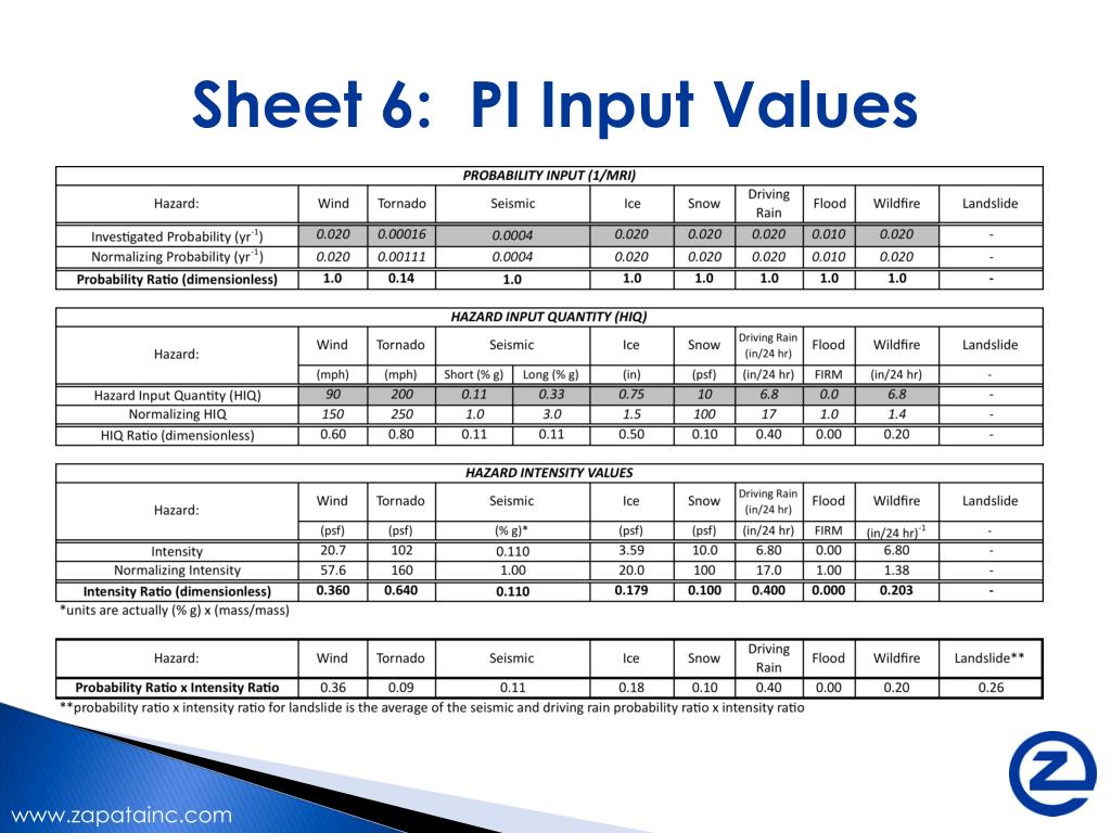 Sheet 10: Output Printout (AI) • Displays the raw output from the input ratings • Contents of this sheet have minimal applicable use • Summarizes the hazard information • Presents an exposure and vulnerability matrix • Presents a raw risk index matrix • Range 0-1 where 0 is lowest risk; 1 is highest risk • All of which is used to produce normalized risk index matrices • Error message at the bottom of sheet is only item needed from this sheet • Error count tallies the number of times a rating outside range limits is input in sheets 1-5