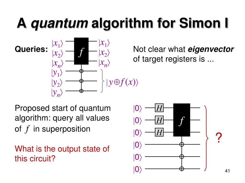 x1 x1 f x2 x2 xn xn y1 y2 yf(x) 0 yn H f 0 H 0 H ? 0 0 0 A quantum algorithm for Simon I Queries: Not clear what eigenvector of target registers is ... Proposed start of quantum algorithm: query all values of f in superposition What is the output state of this circuit?