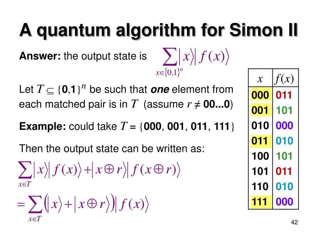 Answer: the output state is A quantum algorithm for Simon II Let T {0,1}nbe such that one element from each matched pair is in T (assume r≠00...0) Example: could take T={000, 001, 011, 111} Then the output state can be written as: