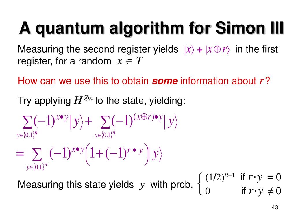 (1/2)n–1 if r∙y=0 0 if r∙y≠0 Measuring this state yields y with prob. A quantum algorithm for Simon III Measuring the second register yields x+xr in the first register, for a random x T How can we use this to obtain some information about r? Try applying Hn to the state, yielding: