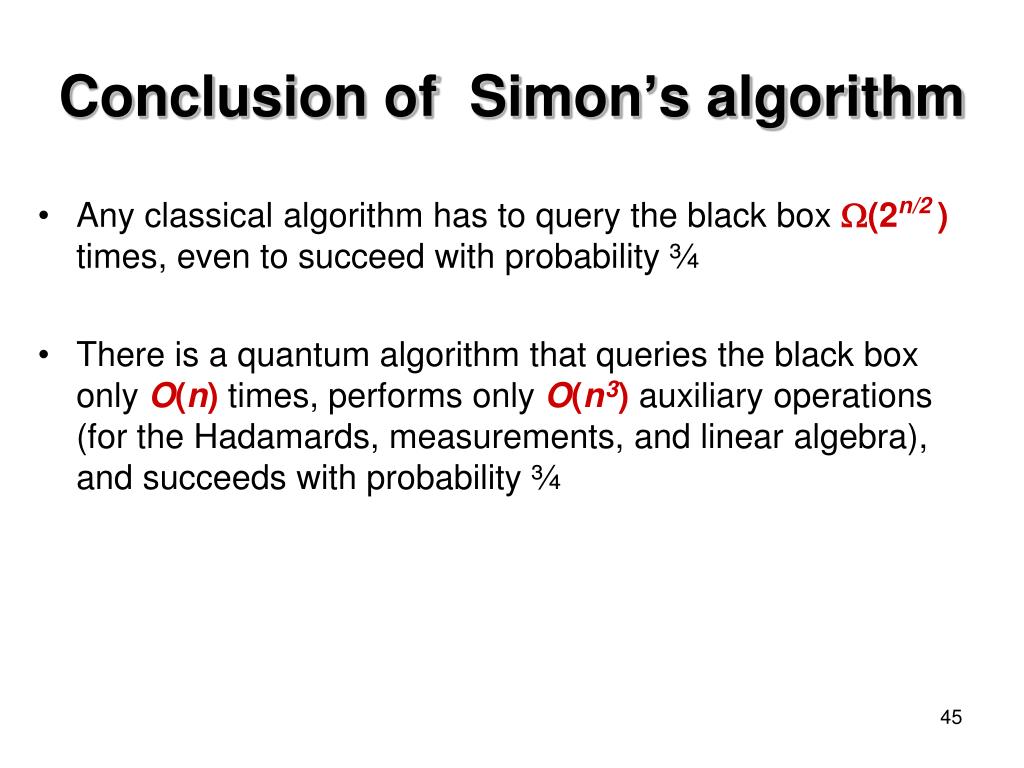 Conclusion of Simon’s algorithm • Any classical algorithm has to query the black box (2n/2) times, even to succeed with probability ¾ • There is a quantum algorithm that queries the black box onlyO(n)times, performs only O(n3)auxiliary operations (for the Hadamards, measurements, and linear algebra), and succeeds with probability ¾