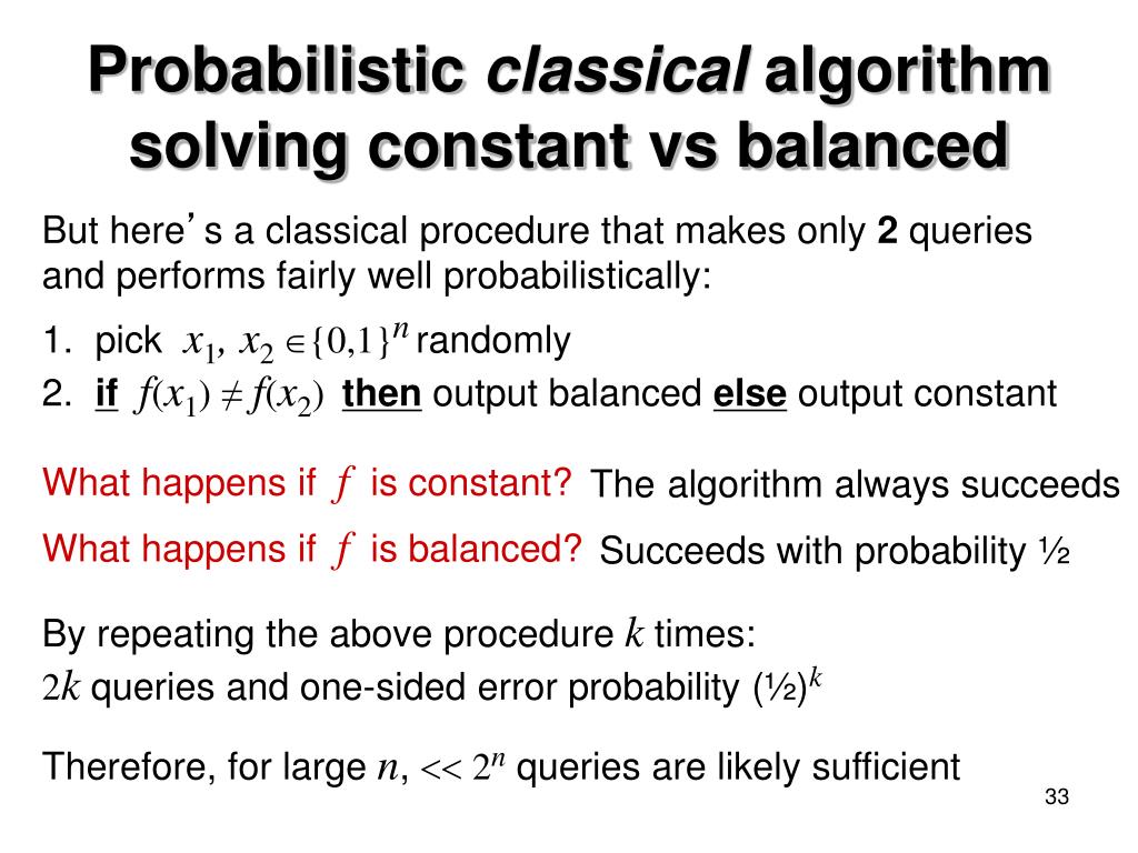 Probabilistic classical algorithm solving constant vs balanced But here’s a classical procedure that makes only 2 queries and performs fairly well probabilistically: • pick x1, x2 {0,1}nrandomly • iff(x1)≠f(x2)then output balanced else output constant What happens if f is constant? Thealgorithm always succeeds What happens if f is balanced? Succeeds with probability ½ By repeating the above procedure k times: 2k queries and one-sided error probability (½)k Therefore, for large n, 2n queries are likely sufficient