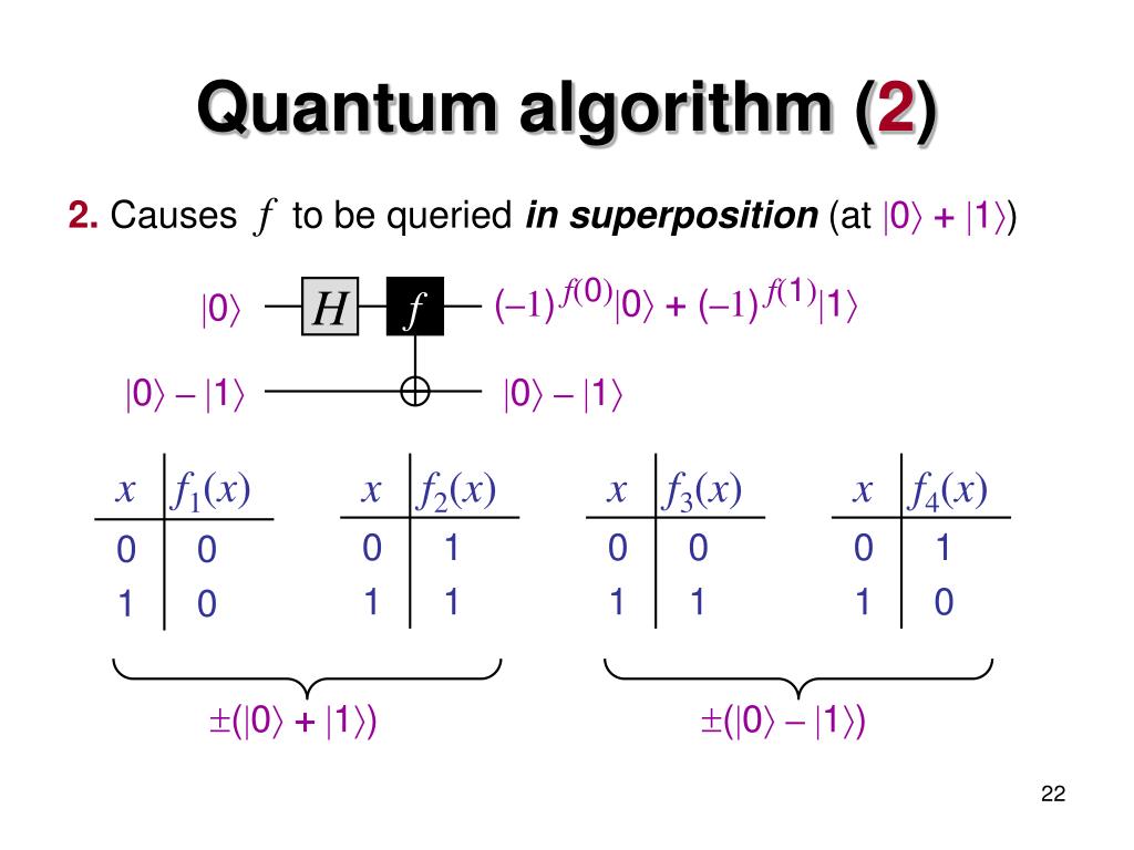 (–1)f(0)0 +(–1)f(1)1 0 H f 0 –1 0 –1 Quantum algorithm (2) 2. Causes f to be queried in superposition (at 0 + 1) (0 +1) (0 –1)
