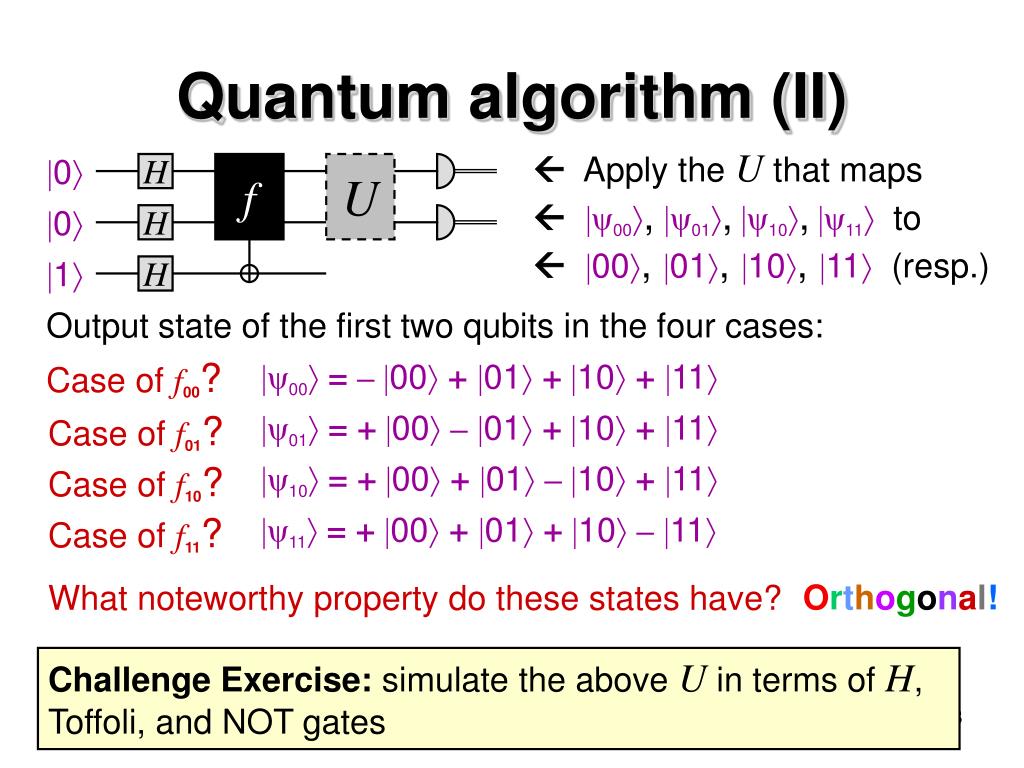 0 H U f 0 H 1 H Quantum algorithm (II) Apply the U that maps ψ00, ψ01,ψ10,ψ11 to 00,01,10,11 (resp.) Output state of the first two qubits in the four cases: Case of f00? ψ00 =–00 + 01 + 10 + 11 Case of f01? ψ01 =+00 – 01 + 10 + 11 Case of f10? ψ10 =+00 + 01 –10 + 11 Case of f11? ψ11 =+00 + 01 + 10 – 11 Orthogonal! What noteworthy property do these states have? Challenge Exercise: simulate the above U in terms of H, Toffoli, and NOT gates