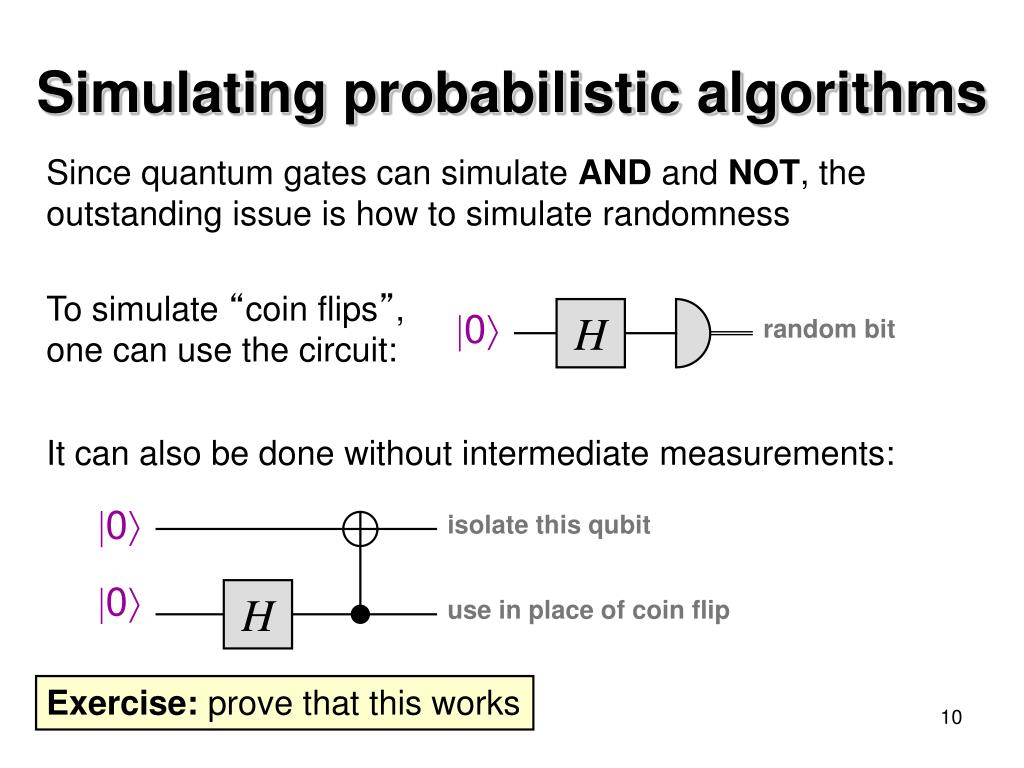 0 H random bit 0 isolate this qubit 0 H use in place of coin flip Simulating probabilistic algorithms Since quantum gates can simulate AND and NOT, the outstanding issue is how to simulate randomness To simulate “coin flips”, one can use the circuit: It can also be done without intermediate measurements: Exercise: prove that this works