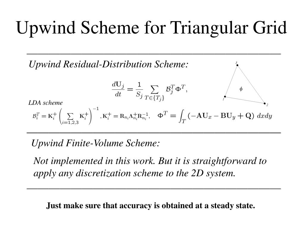 Upwind Scheme for Triangular Grid Upwind Residual-Distribution Scheme: LDA scheme Upwind Finite-Volume Scheme: Not implemented in this work. But it is straightforward to apply any discretization scheme to the 2D system. Just make sure that accuracy is obtained at a steady state.