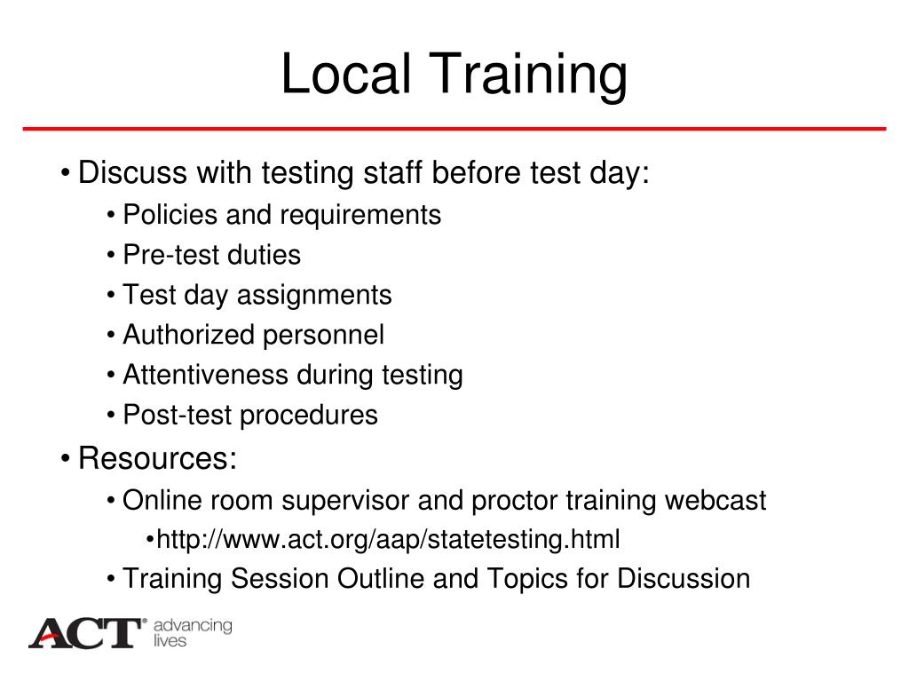 Local Training Discuss with testing staff before test day: Policies and requirements Pre-test duties Test day assignments Authorized personnel Attentiveness during testing Post-test procedures Resources: Online room supervisor and proctor training webcast http://www.act.org/aap/statetesting.html Training Session Outline and Topics for Discussion