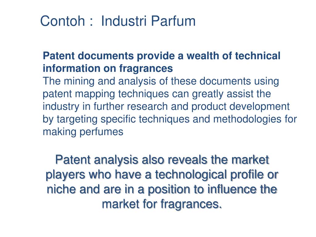 Contoh : IndustriParfum Patent documents provide a wealth of technical information on fragrances The mining and analysis of these documents using patent mapping techniques can greatly assist the industry in further research and product development by targeting specific techniques and methodologies for making perfumes Patent analysis also reveals the market players who have a technological profile or niche and are in a position to influence the market for fragrances.