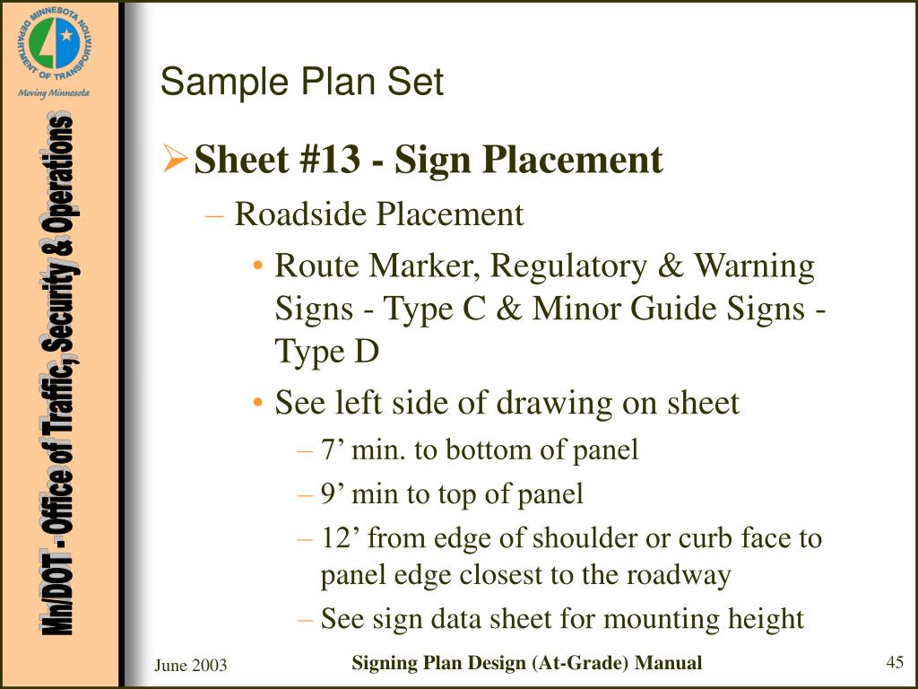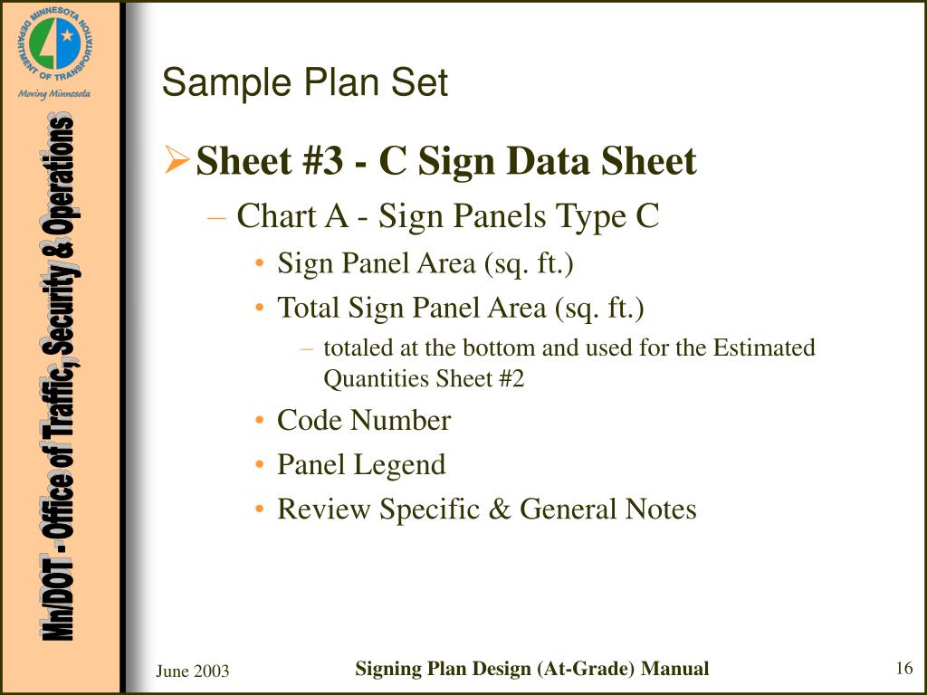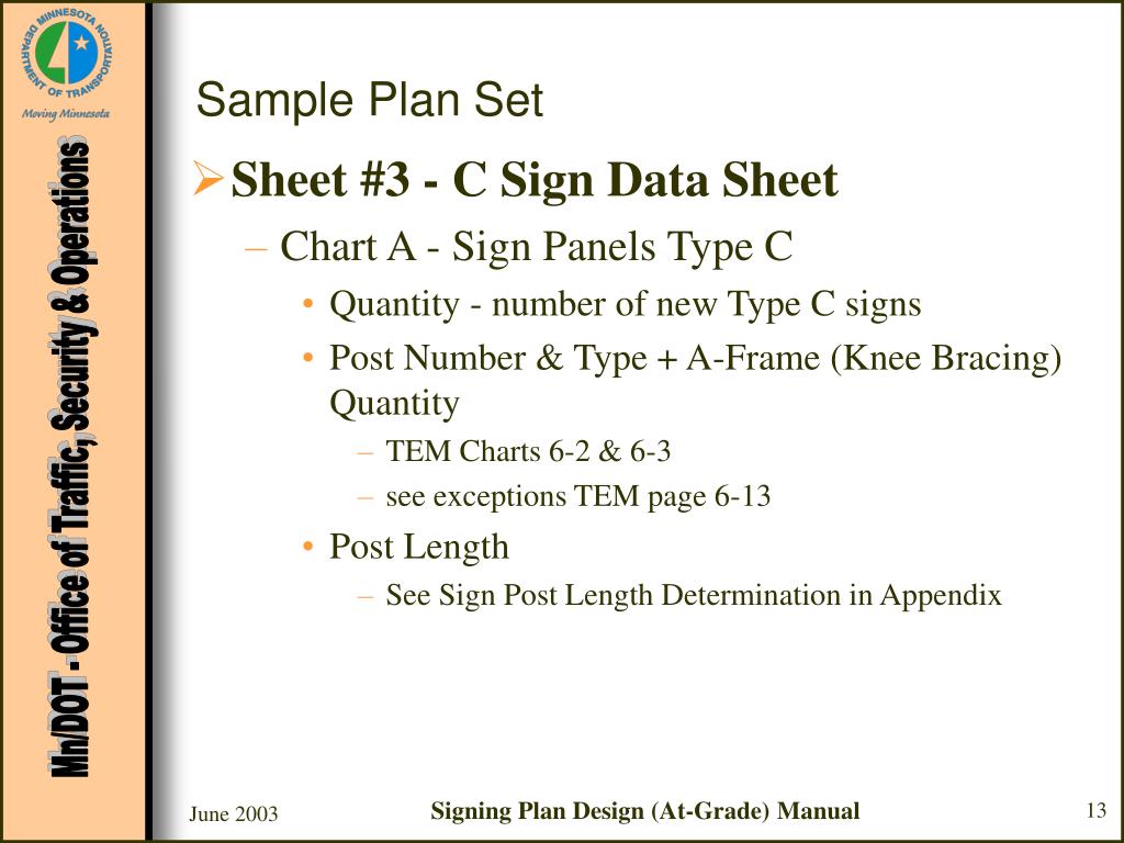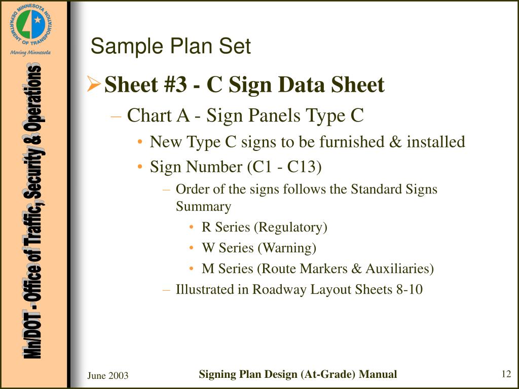 Sample Plan Set • Sheet #3 - C Sign Data Sheet • Chart A - Sign Panels Type C • Panel Size (in.) • Specified in 2002 Standard Signs Summary • Compare size with MN MUTCD, Appendix C • Use larger of the two sizes • STOP sign panel sizes specified in TEM Section 6-5.02.01 Signing Plan Design (At-Grade) Manual