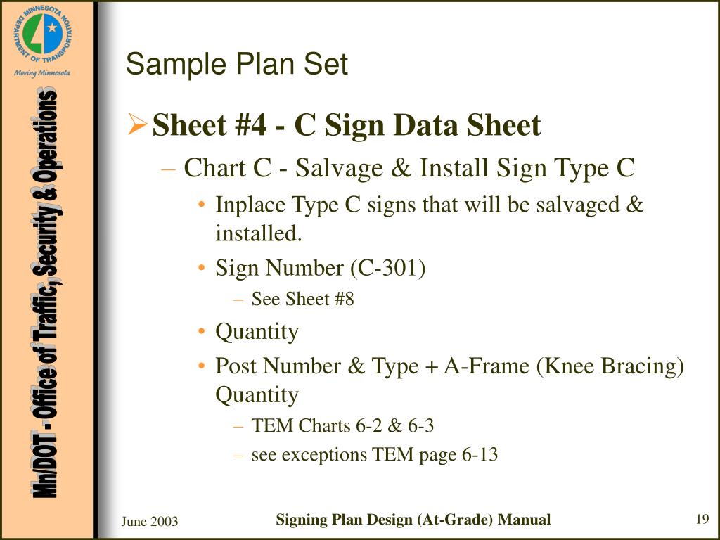 Sample Plan Set • Sheet #4 - C Sign Data Sheet • Chart C - Salvage & Install Sign Type C • Inplace Type C signs that will be salvaged & installed. • Sign Number (C-301) • See Sheet #8 • Quantity • Post Number & Type + A-Frame (Knee Bracing) Quantity • TEM Charts 6-2 & 6-3 • see exceptions TEM page 6-13 Signing Plan Design (At-Grade) Manual