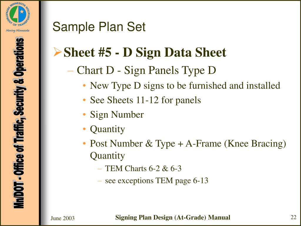 Sample Plan Set • Sheet #5 - D Sign Data Sheet • Chart D - Sign Panels Type D • Post Length • See Sign Post Length Determination in Appendix • Post Spacing • Center to center of posts • Punch codes in Standard Signs Manual • If no punch code found in Standard Signs Manual or if sign structure is unique, refer to TEM Chart 6-4 Signing Plan Design (At-Grade) Manual