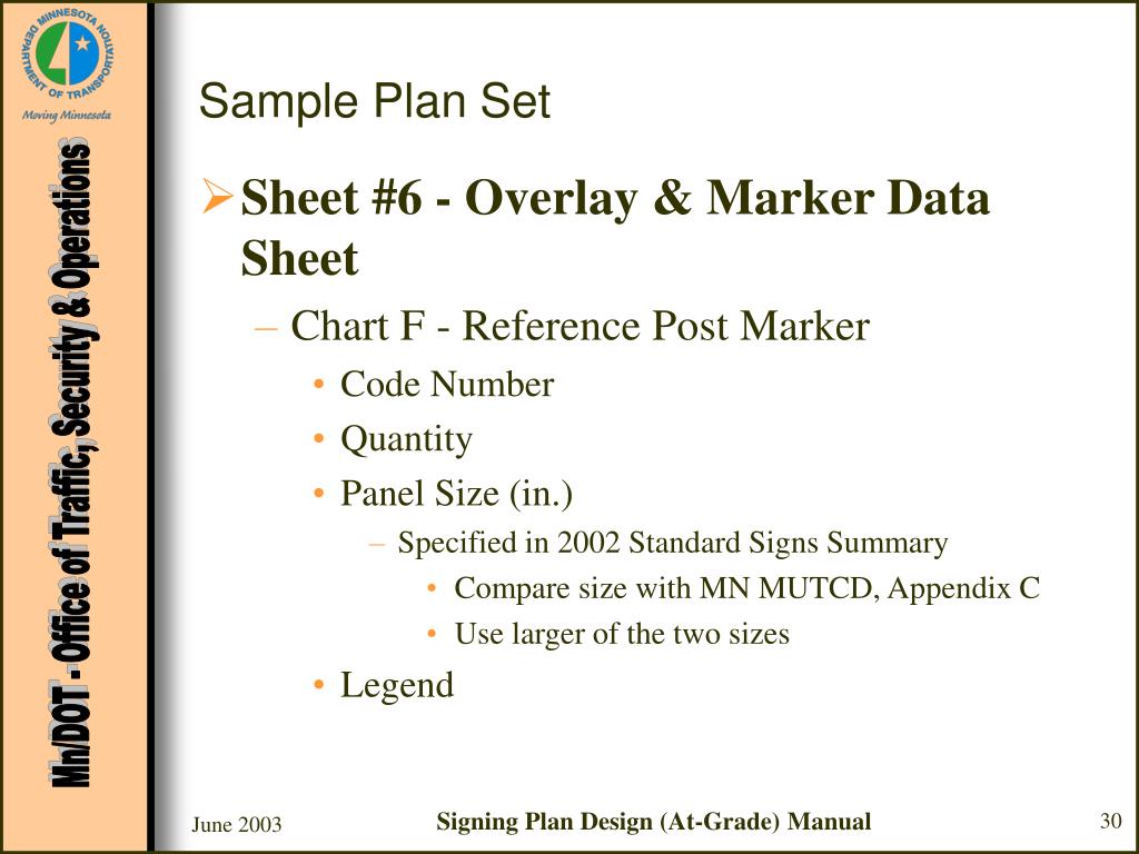 Sample Plan Set • Sheet #6 - Overlay & Marker Data Sheet • Chart F - Reference Post Marker • Code Number • Quantity • Panel Size (in.) • Specified in 2002 Standard Signs Summary • Compare size with MN MUTCD, Appendix C • Use larger of the two sizes • Legend Signing Plan Design (At-Grade) Manual