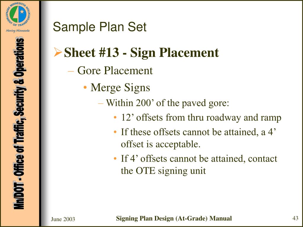 Sample Plan Set • Sheet #13 - Sign Placement • Gore Placement • Merge Signs • Within 200’ of the paved gore: • 12’ offsets from thru roadway and ramp • If these offsets cannot be attained, a 4’ offset is acceptable. • If 4’ offsets cannot be attained, contact the OTE signing unit Signing Plan Design (At-Grade) Manual