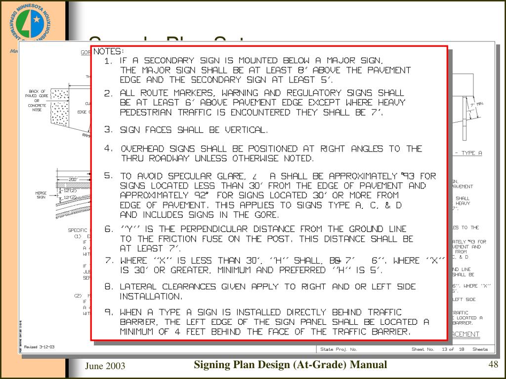 Signing Plan Design - At Grade Intersections Sample Plan Set. Sample Plan Set. Sheet #1 -Title Sheet Index Map Begin & End Project North arrow Scales Plan Revisions Project location within MN Federal Project # Governing Specifications