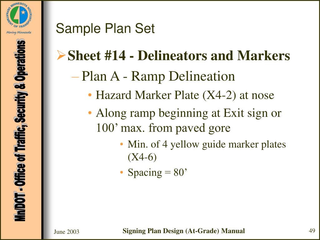 Sample Plan Set • Sheet #14 - Delineators and Markers • Plan A - Ramp Delineation • Along thru roadway opposite first yellow delineator along ramp • Min. of 3 white guide marker plates (X4-6) • Spacing = 100’ Signing Plan Design (At-Grade) Manual