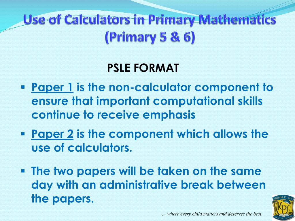 Use of Calculators in Primary Mathematics(Primary 5 & 6) PSLE FORMAT • Paper 1 is the non-calculator component to ensure that important computational skills continue to receive emphasis • Paper 2 is the component which allows the use of calculators. • The two papers will be taken on the same day with an administrative break between the papers.