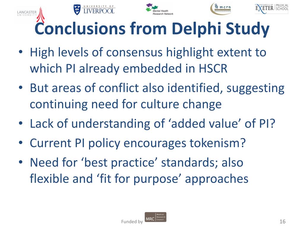 Conclusions from Delphi Study • High levels of consensus highlight extent to which PI already embedded in HSCR • But areas of conflict also identified, suggesting continuing need for culture change • Lack of understanding of ‘added value’ of PI? • Current PI policy encourages tokenism? • Need for ‘best practice’ standards; also flexible and ‘fit for purpose’ approaches