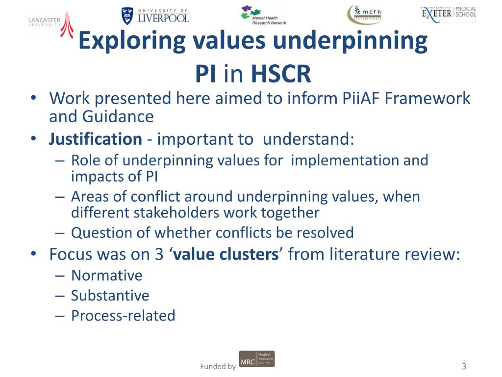 Exploring values underpinningPI in HSCR • Work presented here aimed to inform PiiAF Framework and Guidance • Justification - important to understand: • Role of underpinning values for implementation and impacts of PI • Areas of conflict around underpinning values, when different stakeholders work together • Question of whether conflicts be resolved • Focus was on 3 ‘value clusters’ from literature review: • Normative • Substantive • Process-related