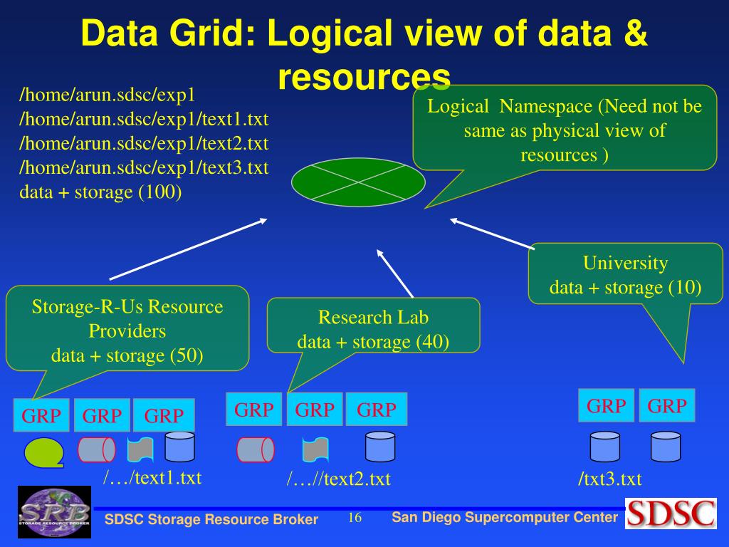 GRP GRP GRP GRP GRP GRP GRP /txt3.txt /…/text1.txt /…//text2.txt Data Grid: Logical view of data & resources /home/arun.sdsc/exp1 /home/arun.sdsc/exp1/text1.txt /home/arun.sdsc/exp1/text2.txt /home/arun.sdsc/exp1/text3.txt data + storage (100) Logical Namespace (Need not be same as physical view of resources ) University data + storage (10) Storage-R-Us Resource Providers data + storage (50) Research Lab data + storage (40) GRP