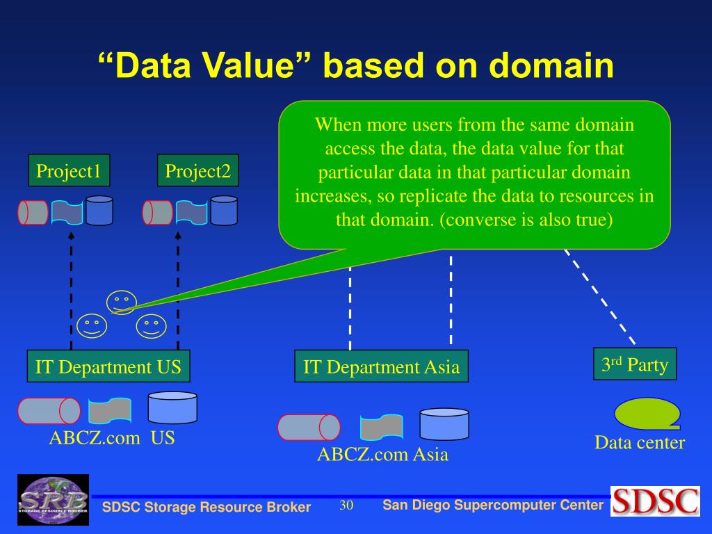 “Data Value” based on domain When more users from the same domain access the data, the data value for that particular data in that particular domain increases, so replicate the data to resources in that domain. (converse is also true) Project1 Project2 Project3 Project4 3rd Party IT Department US IT Department Asia ABCZ.com US Data center ABCZ.com Asia
