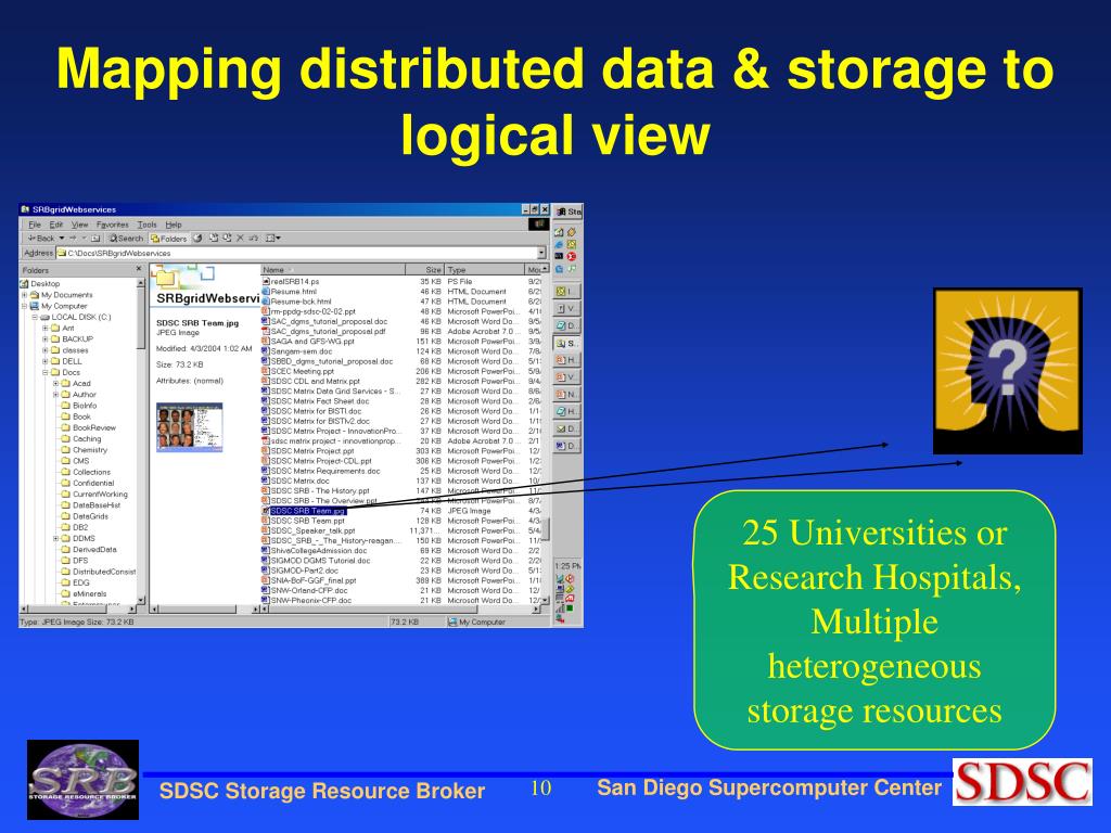 Mapping distributed data & storage to logical view 25 Universities or Research Hospitals, Multiple heterogeneous storage resources