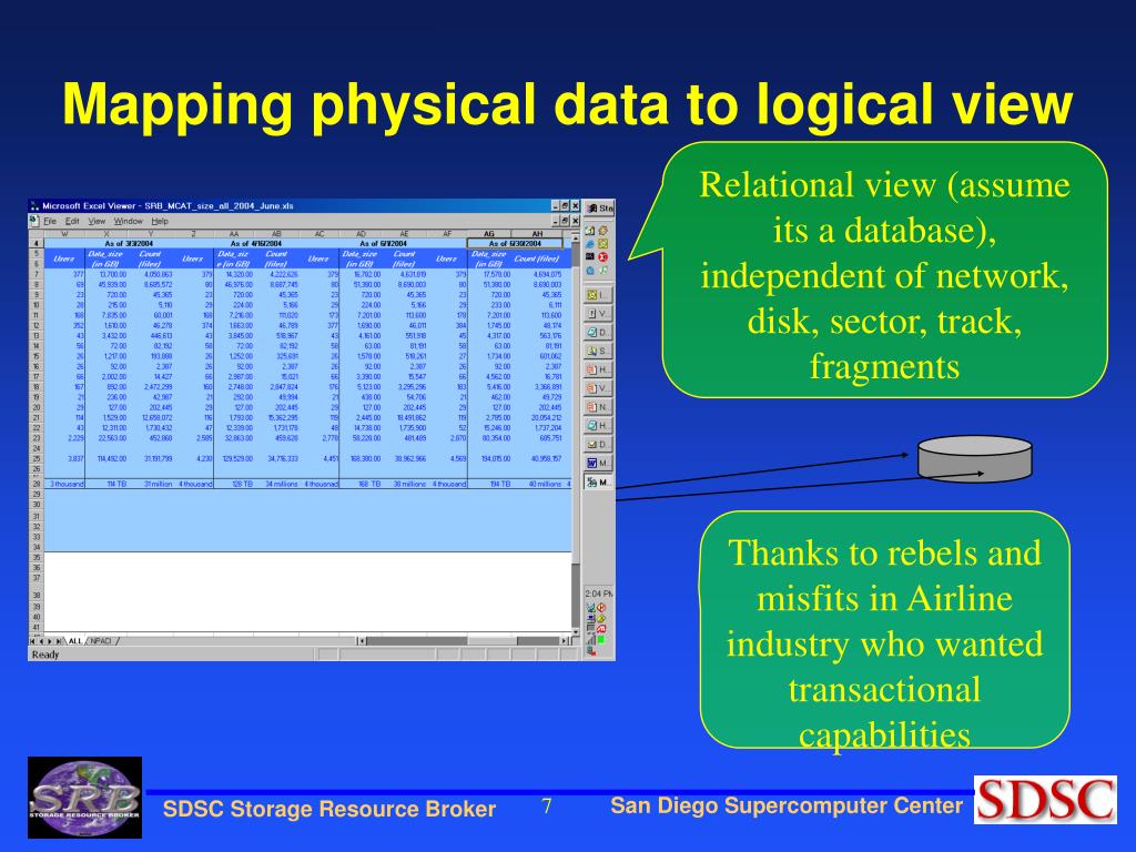 Mapping physical data to logical view Relational view (assume its a database), independent of network, disk, sector, track, fragments Thanks to rebels and misfits in Airline industry who wanted transactional capabilities