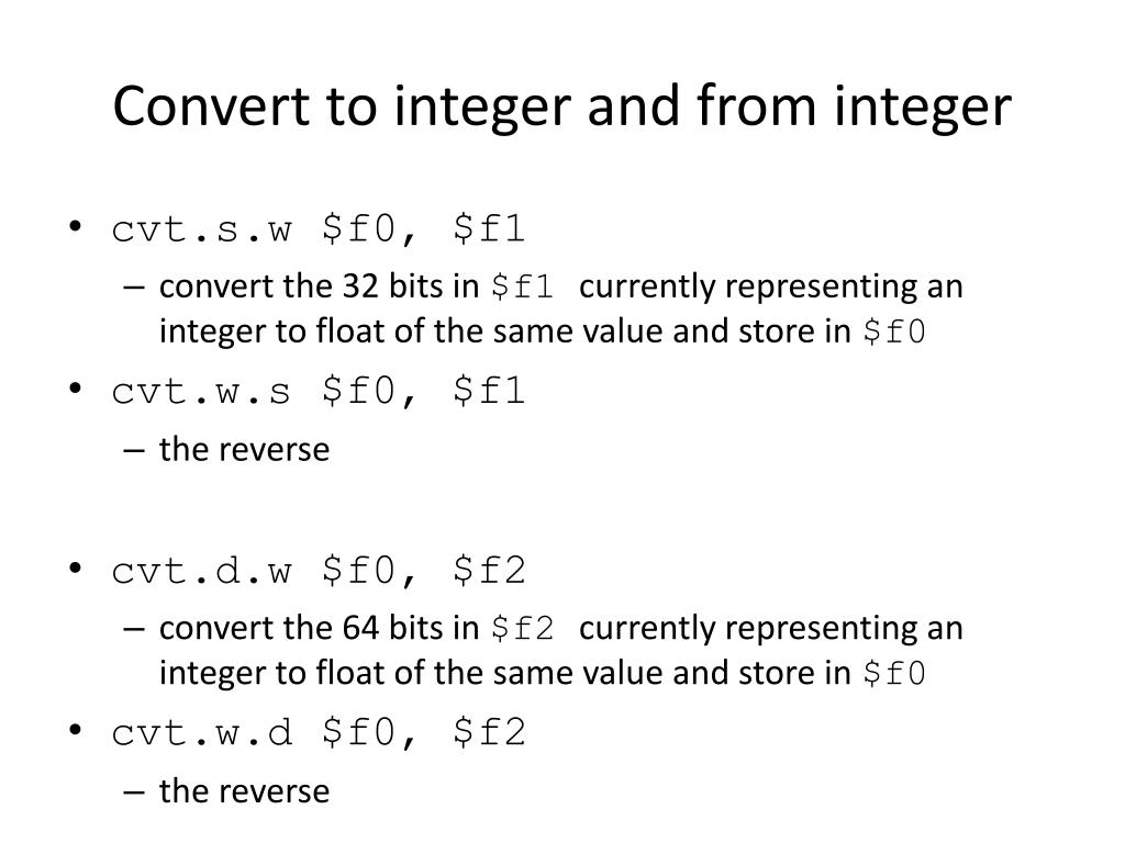 Convert to integer and from integer • cvt.s.w $f0, $f1 • convert the 32 bits in $f1 currently representing an integer to float of the same value and store in $f0 • cvt.w.s $f0, $f1 • the reverse • cvt.d.w $f0, $f2 • convert the 64 bits in $f2 currently representing an integer to float of the same value and store in $f0 • cvt.w.d $f0, $f2 • the reverse