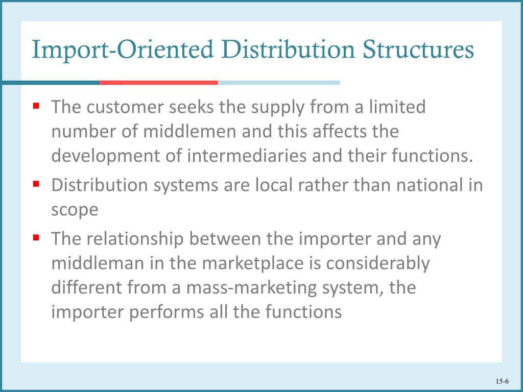 Import-Oriented Distribution Structures • In an import-oriented or traditional distribution structure, an importer controls a fixed supply of goods • The marketing system develops around the philosophy of selling a limited supply of goods at high prices to a small number of affluent customers • In the resulting seller’s market, market penetration and mass distribution are not necessary because demand exceeds supply, and in most cases