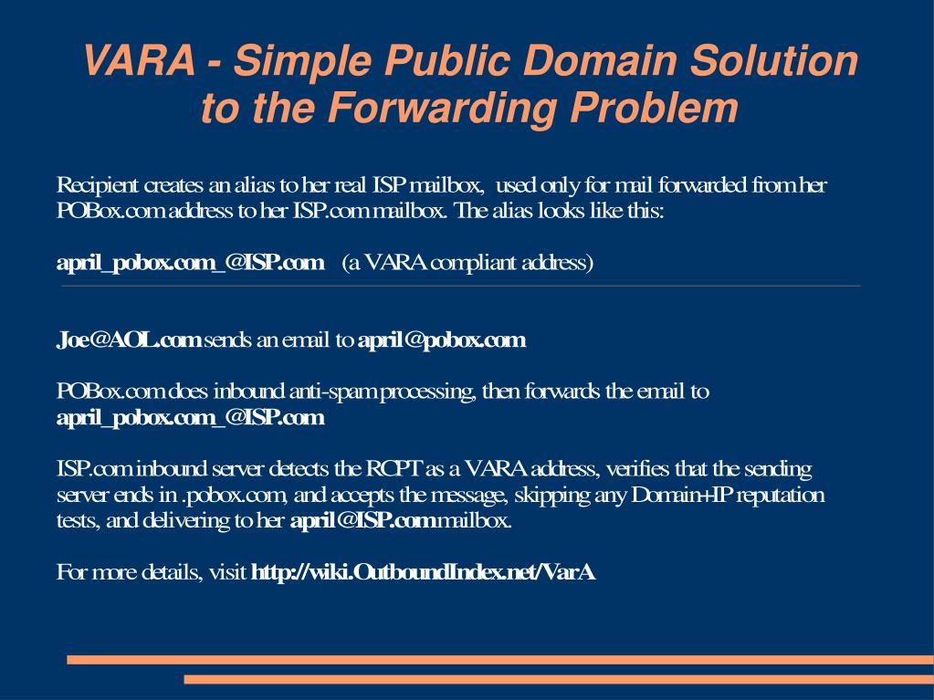 Fowarding is an Issue in Reputation Systems A reputation system that scores an IP address and a domain together should be skipped if the message is coming from a forwarding service or forwarded account Simple public domain mechanisms such as VARA (Verified and Recipient Authorized) are needed to determine when the reputation server query should be skipped