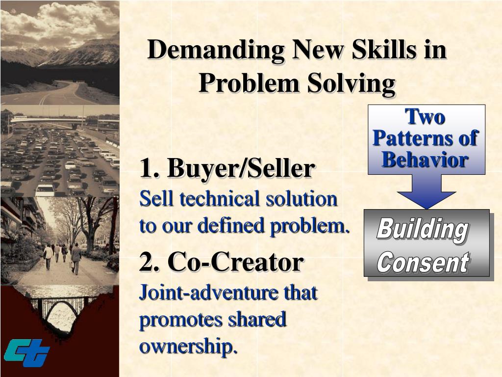 Demanding New Skills in Problem Solving Two Patterns of Behavior 1. Buyer/Seller Sell technical solution to our defined problem. 2. Co-Creator Joint-adventure that promotes shared ownership. Building Consent