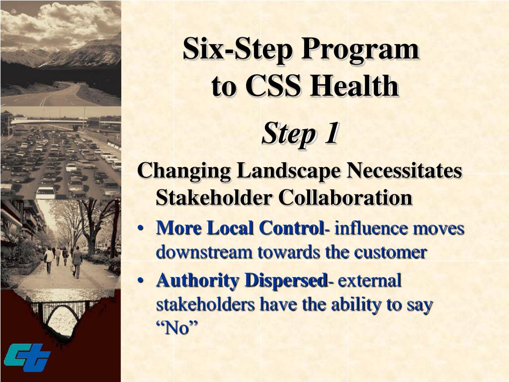 Six-Step Program to CSS Health Step 1 Changing Landscape Necessitates Stakeholder Collaboration • More Local Control- influence moves downstream towards the customer • Authority Dispersed- external stakeholders have the ability to say “No”
