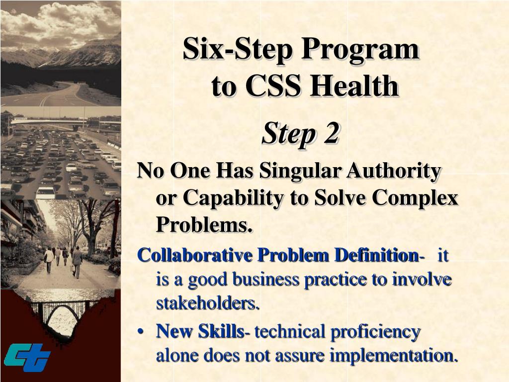 Six-Step Program to CSS Health Step 2 No One Has Singular Authority or Capability to Solve Complex Problems. Collaborative Problem Definition- it is a good business practice to involve stakeholders. • New Skills- technical proficiency alone does not assure implementation.