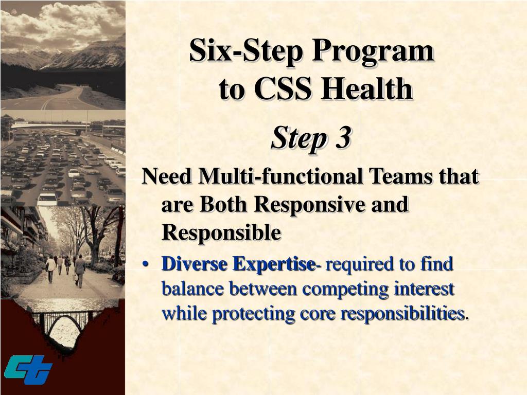 Six-Step Program to CSS Health Step 3 Need Multi-functional Teams that are Both Responsive and Responsible • Diverse Expertise- required to find balance between competing interest while protecting core responsibilities.