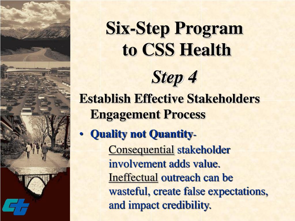 Six-Step Program to CSS Health Step 4 Establish Effective Stakeholders Engagement Process • Quality not Quantity- Consequential stakeholder involvement adds value. Ineffectual outreach can be wasteful, create false expectations, and impact credibility.