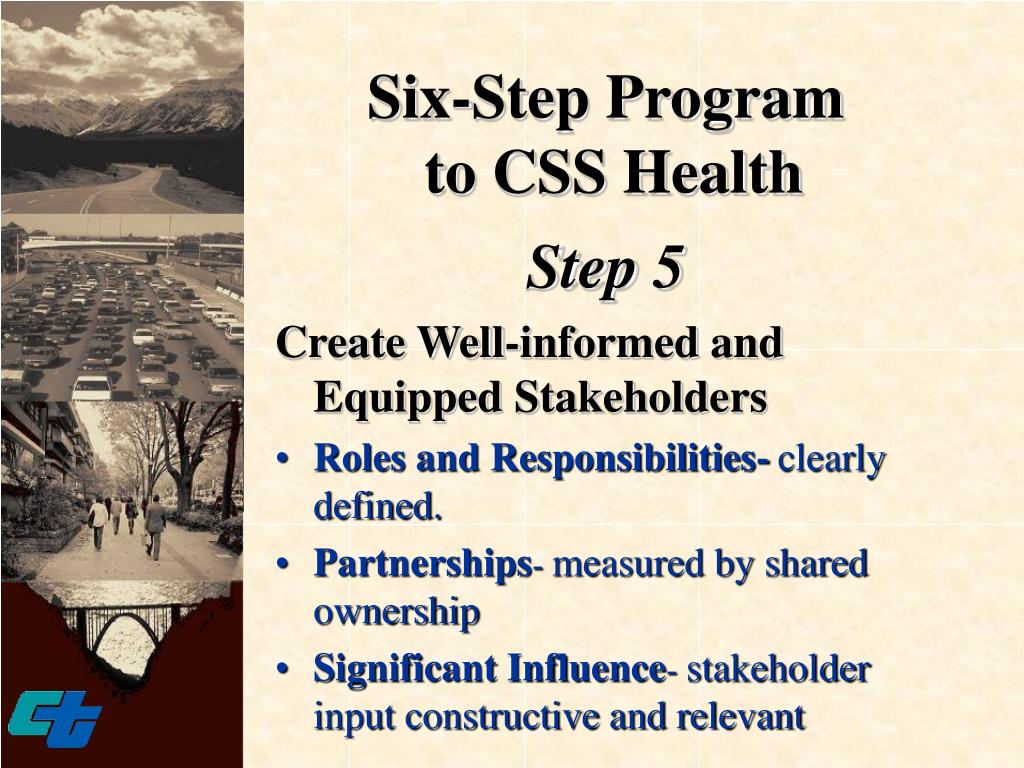 Six-Step Program to CSS Health Step 5 Create Well-informed and Equipped Stakeholders • Roles and Responsibilities-clearly defined. • Partnerships- measured by shared ownership • Significant Influence- stakeholder input constructive and relevant