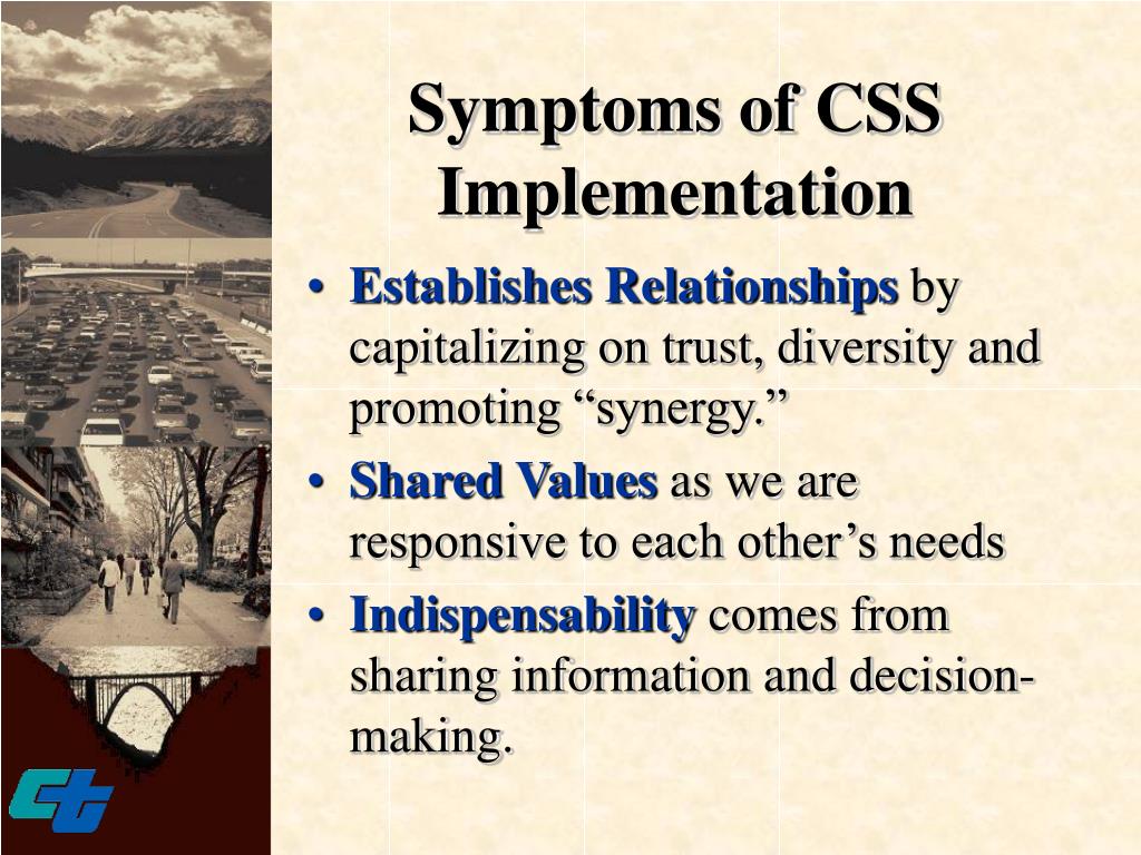 Symptoms of CSS Implementation • Establishes Relationshipsby capitalizing on trust, diversity and promoting “synergy.” • Shared Values as we are responsive to each other’s needs • Indispensability comes from sharing information and decision-making.