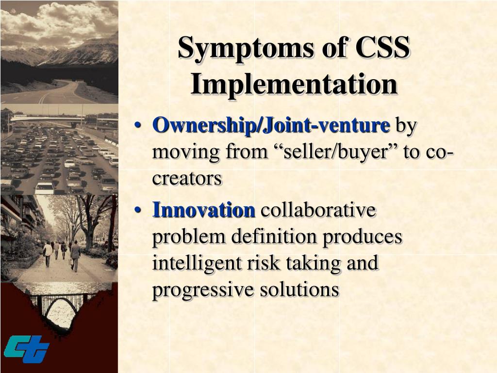 Symptoms of CSS Implementation • Ownership/Joint-ventureby moving from “seller/buyer” to co-creators • Innovationcollaborative problem definition produces intelligent risk takingandprogressive solutions