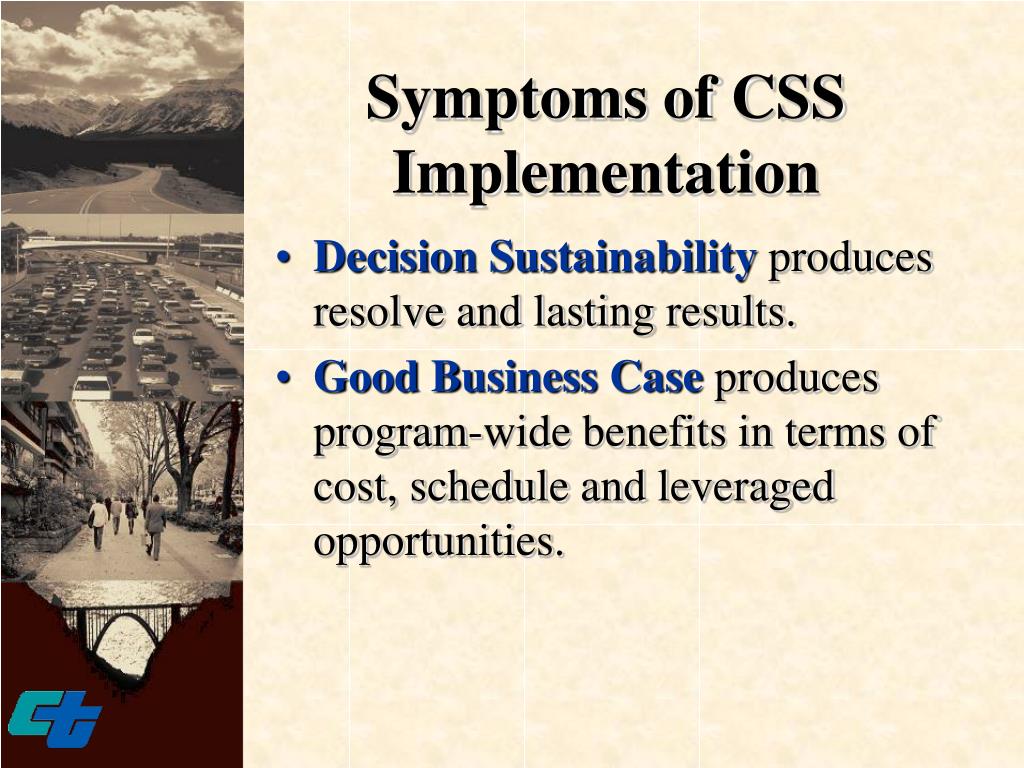 Symptoms of CSS Implementation • Decision Sustainabilityproduces resolve and lasting results. • Good Business Case produces program-wide benefits in terms of cost, schedule and leveraged opportunities.