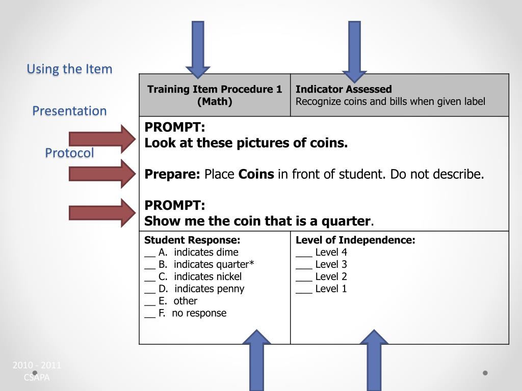 Welcome to the 2011 CSAPA Examiner Training. Secondary instruction presented by Miranda Young. Elementary instruction presented by Candi Diaz. Using the Item Presentation Protocol. Test Administration. Test Examiners record two pieces of information:. No Response. No Response