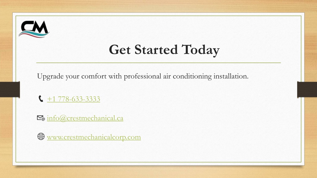 Get Started Today Upgrade your comfort with professional air conditioning installation. ? +1 778-633-3333 ? info@crestmechanical.ca ? www.crestmechanicalcorp.com