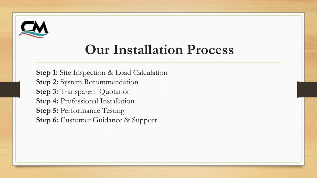 Our Installation Process Step 1: Site Inspection & Load Calculation Step 2: System Recommendation Step 3: Transparent Quotation Step 4: Professional Installation Step 5: Performance Testing Step 6: Customer Guidance & Support