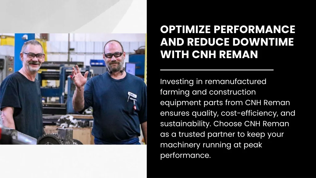 Discover how CNH Remanu2019s high-quality, remanufactured parts are essential for maximizing the performance of farming and construction equipment. This presentation covers the key benefits of remanufactured parts, including cost savings, environmental impact, and quality assurance, ensuring your equipment operates efficiently and reliably in demanding conditions.