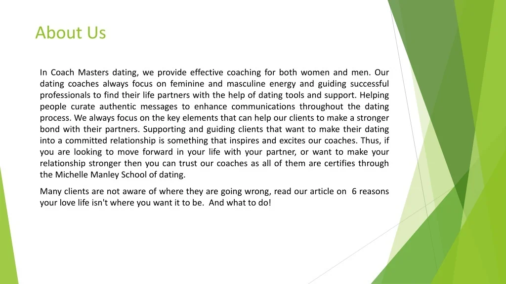 About Us In Coach Masters dating, we provide effective coaching for both women and men. Our dating coaches always focus on feminine and masculine energy and guiding successful professionals to find their life partners with the help of dating tools and support. Helping people curate authentic messages to enhance communications throughout the dating process. We always focus on the key elements that can help our clients to make a stronger bond with their partners. Supporting and guiding clients that want to make their dating into a committed relationship is something that inspires and excites our coaches. Thus, if you are looking to move forward in your life with your partner, or want to make your relationship stronger then you can trust our coaches as all of them are certifies through the Michelle Manley School of dating. Many clients are not aware of where they are going wrong, read our article on 6 reasons your love life isn't where you want it to be. And what to do!