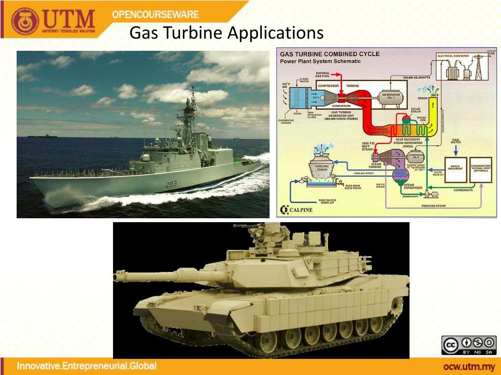 Gas Turbine Applications • Aircraft propulsion system • Electric power generation • Marine vehicle propulsion • Combined-cycle power plant (with steam power plant) • Tanks