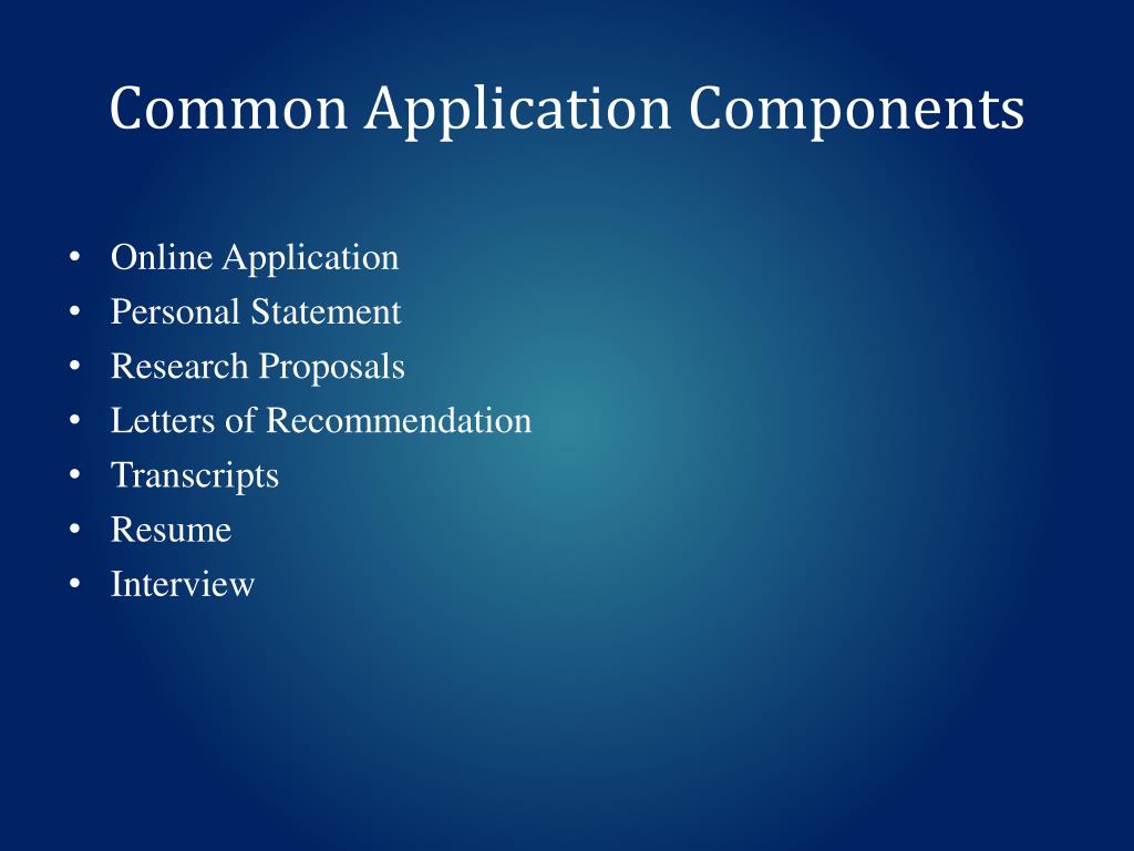 Common Application Components • Online Application • Personal Statement • Research Proposals • Letters of Recommendation • Transcripts • Resume • Interview